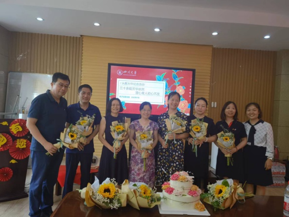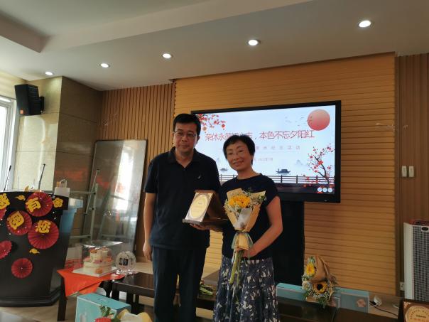公司党委书记邰明松同志为荣休教师和从教30年教师颁发纪念章及纪念品并与老师们合影留念,公司青年教师代表向荣休教师及从教30年教师献花。