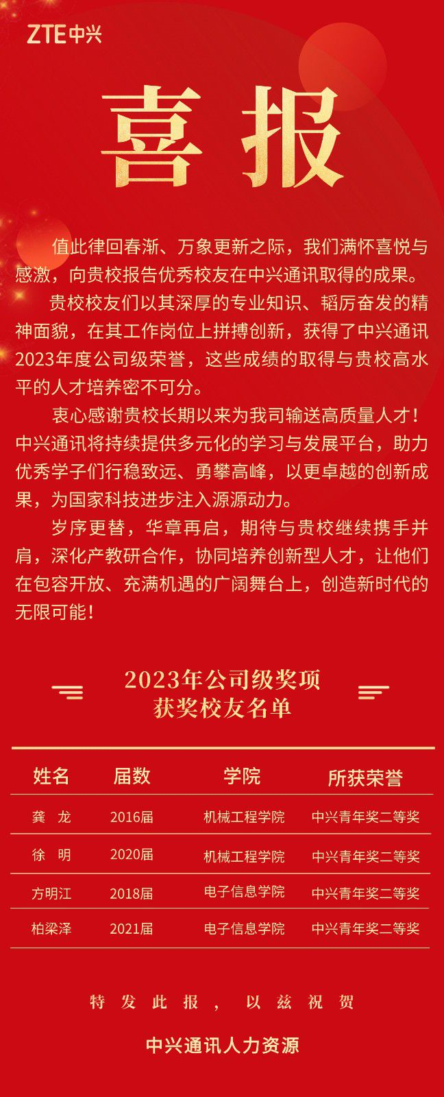 近日,公司收到中兴通讯发来的喜报,对获得中兴通讯2023年度公司级荣誉的优秀员工进行通报,并感谢公司为公司输送的高质量人才。其中,公司2018届硕士毕业生方明江、2021届硕士毕业生柏梁泽都荣获中兴青年奖二等奖。