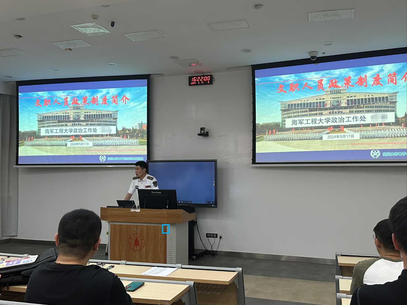 随后,以海工大宣传片为引,政治工作处王老师带来了人才引进相关政策的介绍。王老师从军队文职人员制度历程、文职人员职业发展和文职人员待遇保障等部分展开,对文职人员政策制度进行了详细的解读。其中重点介绍了公司文职人员的招录体系和岗位需求,文职人员“优才优待、优绩优奖”的激励导向和待遇政策。其次,王老师以“教师的尊崇、稳定的编制、健全的体制、优越的环境”四方面概括了公司文职人员优异的发展前景。讲解最后,王老师再次表达了海工大对人才引进的重视,并号召同学们积极加入建设强大的人民海军。