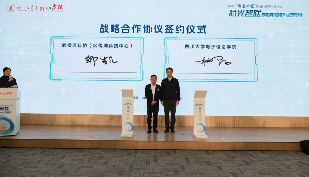 公司经理杨阳代表公司与成都市武侯区科学技术协会(区悦湖科技中心)签署了战略合作协议,依托武侯区重点打造的悦湖科技城(成都市首批人工智能与机器人"样板"产业园)充分发挥公司在芯片研发、人工智能、通信技术等领域的科研优势,与武侯区的产业需求和服务资源深度融合,共同推动前沿科技成果的转化与应用。公司党委副书记黄园,公司党委书记彭舰代表校院与武侯区政府共同启动“诸葛论道”系列活动,旨在通过政府搭台,汇聚专家的“智力资源”、对接企业的“技术需求”、强化政府的“服务保障”,促进“纸上成果”加速走向“产业实效”,助力区域经济高质量发展。