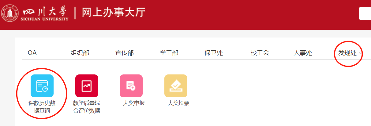 Ⅱ.进入网上办事大厅后,依次点击红圈中的“更多”——“发规处”——“评教历史数据查询”图标。