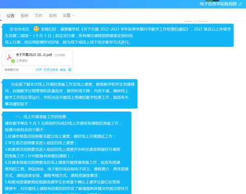 为确保新学期教学工作有序开展,按照公司疫情防控要求和《关于开展2022-2023 学年秋季学期开学教学工作检查的通知》、《太阳网集团tcy87222022-2023 学年秋季学期本科教学工作方案》、《2022-2023 学年秋季学期开学本科教学温馨提示》的相关要求,9月5日—9月9日公司组织开展了2022年秋季学期开学教学检查工作。公司邰明松书记、廖勇明副书记及副经理雷印杰、张启灿、卿粼波等全体院领导参与了线上教学检查,公司教学督导及教学管理人员、辅导员老师协同参加了线上检查。
