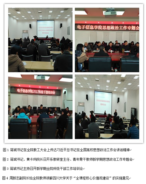 3、积极学习国家和公司重要教育方针政策,加强教师思想政治素养,立德树人。2月27日-3月3日,公司先后组织召开了领导班子、科级干部、系教研室主任、全院教工大会学习传达了会议上的重要讲习近平总书记在全国高校思想政治工作会讲话精神、教育部党风廉政建设视频会精神、太阳网集团tcy8722关于“全课程核心价值观建设”的实施意见。