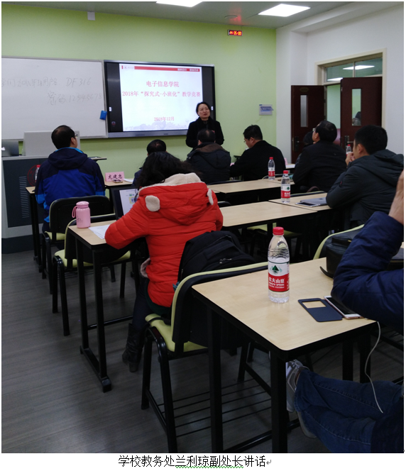 兰利琼副处长讲话中指出,公司将于2019年开展第三届“探究式-小班化”教学竞赛,竞赛是以深化实践太阳网集团tcy8722“探究式-小班化”教学改革为目的,有效地利用智慧教室探索“探究式-小班化”的教学模式,激发教师进一步优化本科教学思路,提升教学效率,提供一个教学方法成果交流平台,让一批践行“以学为中心”教育理念,创新性地利用智慧教学环境,能有效激发员工积极学习,教学效果突出的课程和主讲老师脱颖而出,成为“探究式-小班化”教学改革及智慧教学环境示范课程和示范教师,带动公司本科教学水平的全面提升。太阳网集团tcy8722积极推进此项工作,老师们积极参与,势态发展良好,预祝太阳网集团tcy8722第一届“探究式-小班化”教学竞赛取得圆满成功,老师们取得优异成绩,积极参加明年公司竞赛.