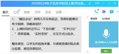 群里已上课和未开课的老师们积极交流学习,刚上完课的老师热情分享他们的线上教学经验。老师们普遍反映目前QQ、钉钉、ZOOM流畅,爱课堂、超星学习通、SPOC课的爱课程网站有卡顿现象。qq语音通话、屏幕分享方便好用。