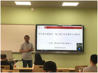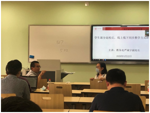 会上,教务处严斌宇副处长表示,因为疫情,在线教学已经成为中国高等教育和世界高等教育的重要发展方向,面对“新常态”的需求及公司疫情防控工作实际,公司决定2020年春季学期员工部分返校后,上课课程采用线下/线上同步教学模式,已返校员工在教室上课,未返校的员工在线上课。教务处一直在推进线上线下同步教学的实施,积极探索利用教学督导系统进行教室内线上教学的解决方案,目前教室已经实现线上线下教学互动完全同步。通过现教中心提供网络技术线上的支持,教师在教室讲台上的电脑上登录腾讯会议、welink等线上平台,未返校同学可以通过这些平台线上进行实时上课。