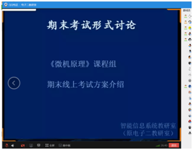 《微机原理与接口技术》课程组的教师代表卿粼波副教授介绍了该课程组关于此次期末考试的考虑,拟采用合适的考试形式避免员工死记硬背,重点考查分析能力;此外,关于发送试卷的方式和单/双机位等具体细节也进行了仔细考虑。赵成萍副教授进行了相关补充。