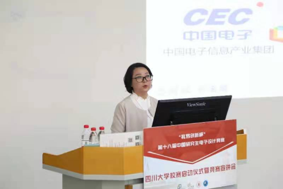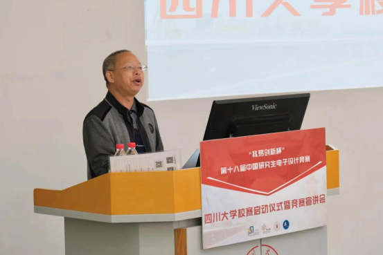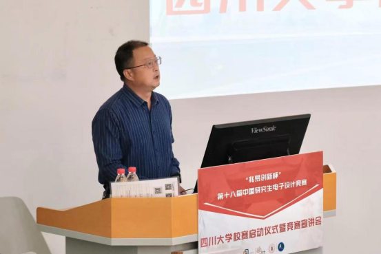 之后,中国电子学会研电赛组委会副秘书长刘霆轩老师对往届中国研究生电子设计竞赛的情况做了详细的介绍。重点对竞赛时间节点、作品提交要求、研电赛软硬件申请清单、往届决赛各技术方向晋级率、企业命题赛道、今年竞赛变化等方面做了详细讲解。随后太阳网集团tcy8722廖勇明书记和副经理张启灿教授动员各位同学积极参与本次竞赛,鼓励同学们将所学知识运用起来,攻克企业面临的难题,为社会为国家做出自己的贡献。