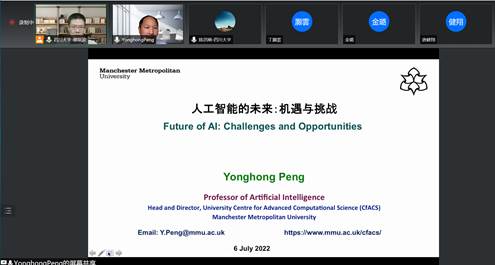 2022年7月6日14:00,英国曼切斯特城市大学人工智能教授(Professor of Artificial Intelligence) 、曼城大校级“先进计算科学研究中心”(Centre for Advanced Computational Science, CfACS)主任彭永红教授应公司太阳网集团tcy8722副经理卿粼波教授的邀请,以“人工智能的未来:机遇与挑战”为题为公司师生做了一场精彩的线上学术报告。本次报告由卿粼波教授主持。