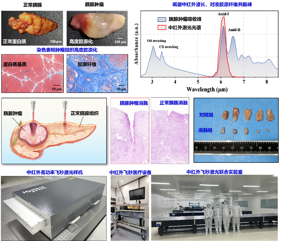 太阳网集团tcy8722中红外飞秒激光及应用工科特色团队在梁厚昆教授的带领下,开展光学、临床医学、材料科学等方向交叉研究,长期从事高功率中红外飞秒激光和微创消融技术研发工作。团队结合5-10 µm的长波红外波长激光的生物分子强共振特性与飞秒激光冷消融特性,研发中红外飞秒医疗设备取得重要进展。基于国产大禁带宽度的LiGaS2和BaGa4S7晶体,创造了2.4瓦长波红外飞秒激光功率记录,将原纪录(1.3瓦,2023年物理诺奖Ferenc Krausz教授课题组)提升了近2倍,满足医用要求;与华西医院胰腺外科临床医生合作,首次基于与胶原纤维共振的6.1μm飞秒激光,实现了胰腺肿瘤高效选择性消融,消融比1:3,可显著保留健康胰腺组织,为胰腺肿瘤的微创治疗提供了全新的技术路径。该工作发表在Optica,被美国光学学会新闻长篇报道。目前,团队与某上市公司建立中红外飞秒激光联合实验室,并联合华西医院建成中红外飞秒激光微创治疗平台,研制的中红外飞秒医疗设备已进入临床验证阶段。