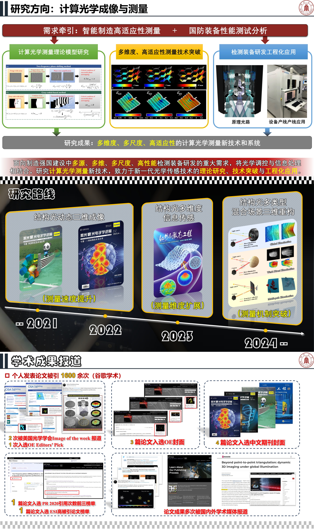 从事光学三维传感、光测力学、单像素成像等方面的研究工作,致力于计算光学成像与测量技术的理论研究、技术突破与工程化应用。在Light: Advanced Manufacturing,Laser & Photonics Reviews,Photonics Research,IEEE TIM,Optics Letters等期刊上发表SCI论文30余篇,EI检索论文10余篇,被引1600余次(谷歌学术,更新至2025.12.10),h指数21。论文3篇入选Optics Express封面论文,1篇入选Editors’ pick论文,2篇被美国光学学会以“Image of the Week”形式进行报道,5篇入选中文光学期刊封面。为Nat. Commun., TPAMI, Opt. Letters, Opt. Express, Opt. Laser Eng., Exp. Mech., Sci. Rep., Expert. Syst. Appl.等领域高水平SCI期刊的审稿人。申请国家发明专利14项,其中7项获得授权。