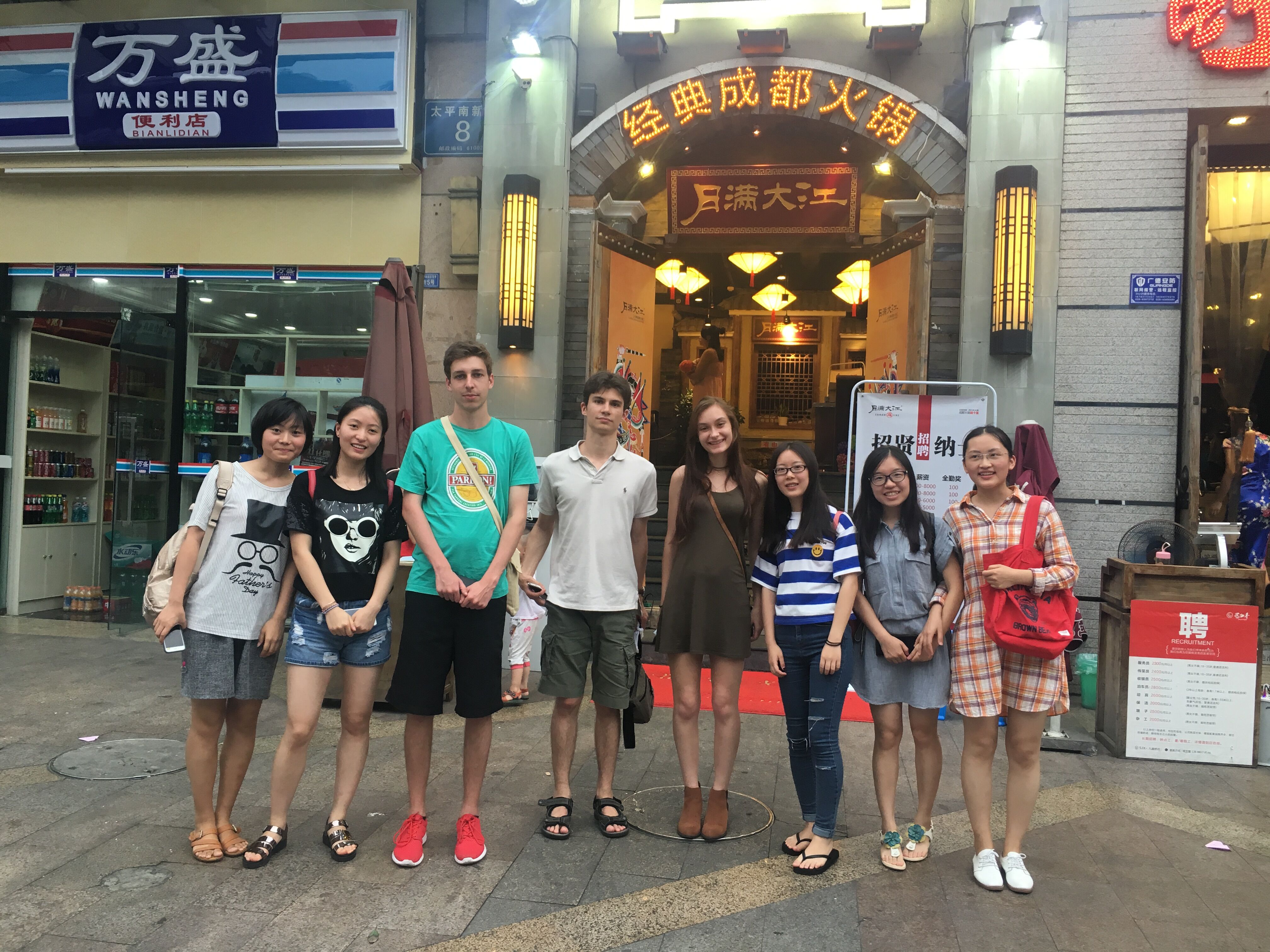 来到一个地方,肯定是要尝尝这里的美食的,我们沿路边吃边聊,买了纪念品,聊到了法国饮食,中国交通等等……最后结束锦里行时我们回到了望江校区附近吃了一顿火锅。这一天虽然热,累,还语言不是很流畅,互相之间交流起来有压力,外国友人对于中国文化还有很多的不了解,但是只要勇于尝试敢于去做,会收获很多,感受很深。