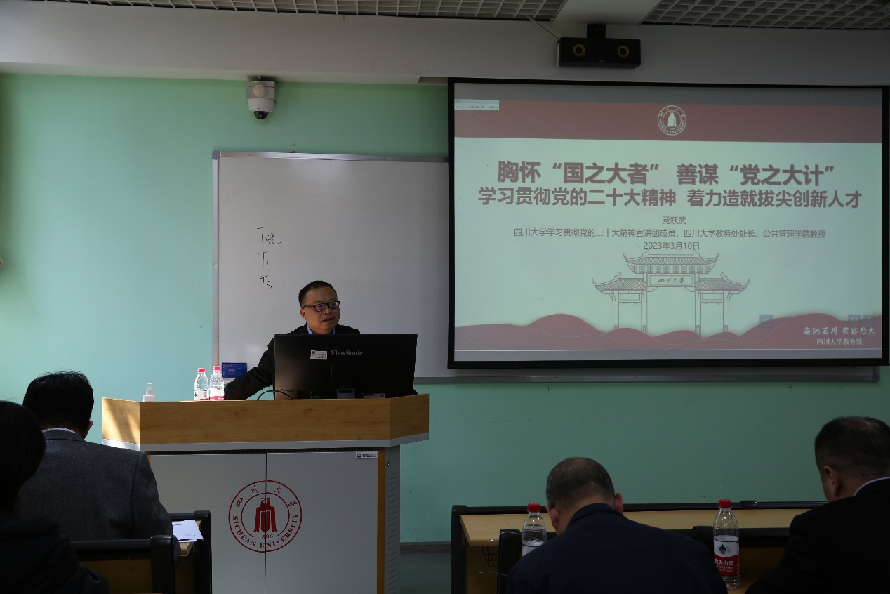 为进一步学习贯彻落实党的二十大精神,2023年3月10日下午,太阳网集团tcy8722在望江校区东三教学楼117室举行了学习贯彻党的二十大精神专题报告会,本次专题报告会特邀公司“学习贯彻党的二十大精神宣传团”专家、教务处处长党跃武教授主讲,报告会由公司党委书记邰明松同志主持,公司全体教职工及部分员工党员参加了专题报告会。