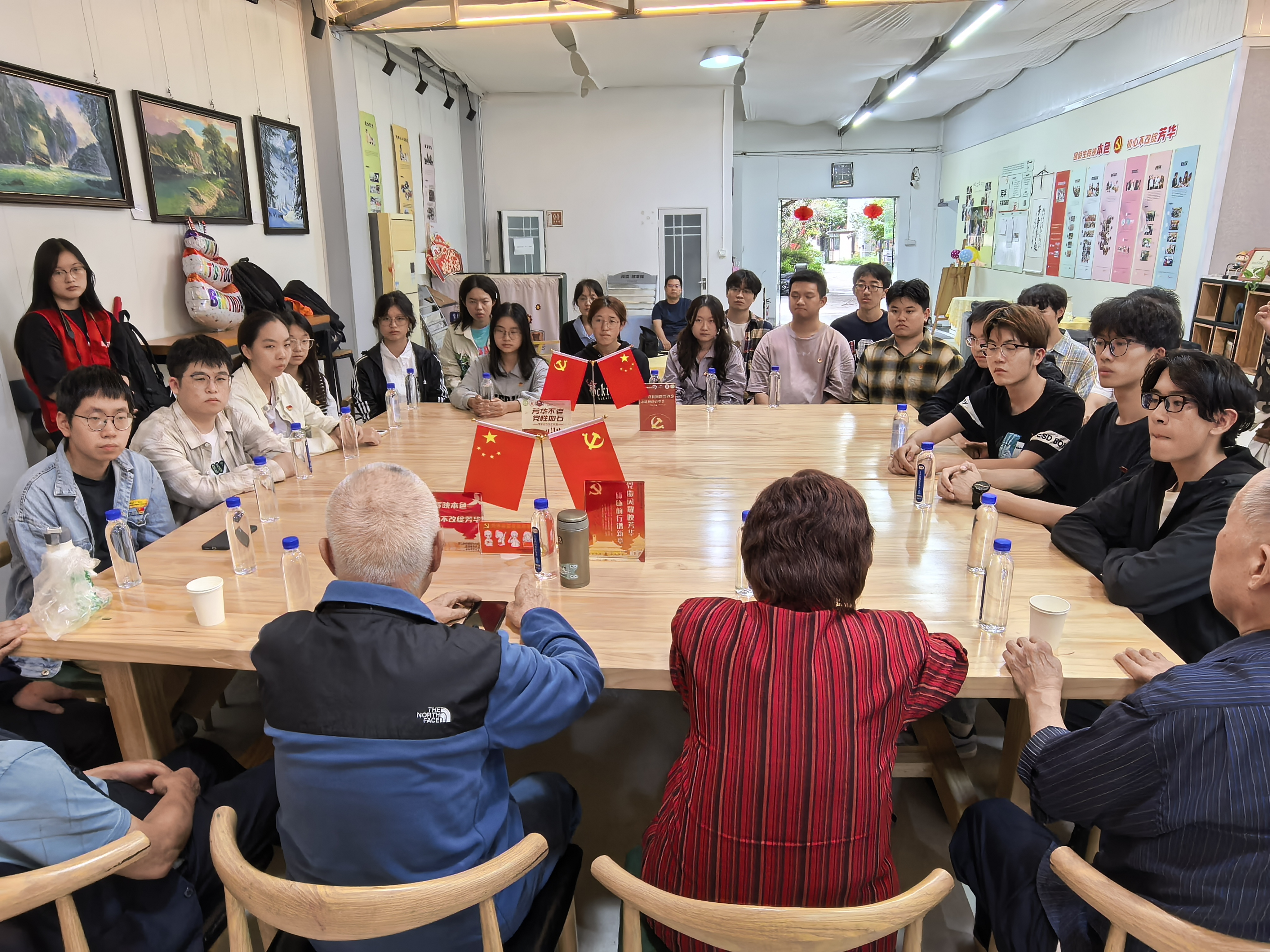 图为同学们围坐在老党员们旁认真聆听