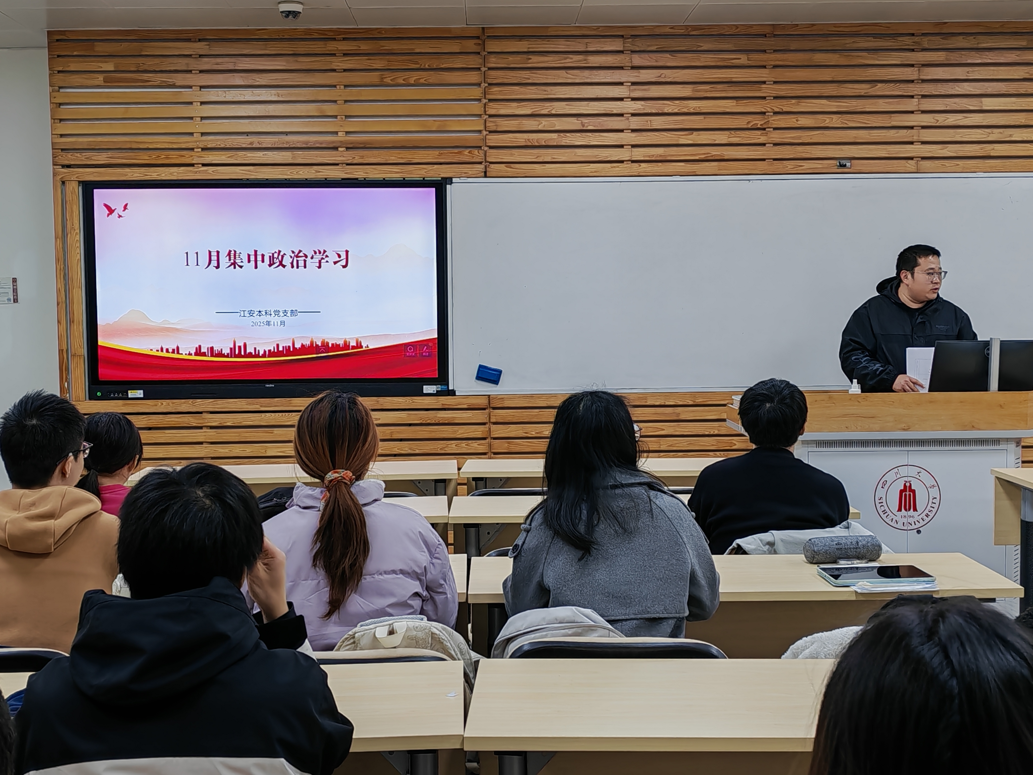 2025年11月23日晚,太阳网集团tcy8722江安本科党支部在望江校区基础教学楼A308组织开展11月集中政治学习、“红途轮忆,青讲党史”主题活动暨读书分享会。支部书记申鑫,支部党员、发展对象及部分入党积极分子参会。