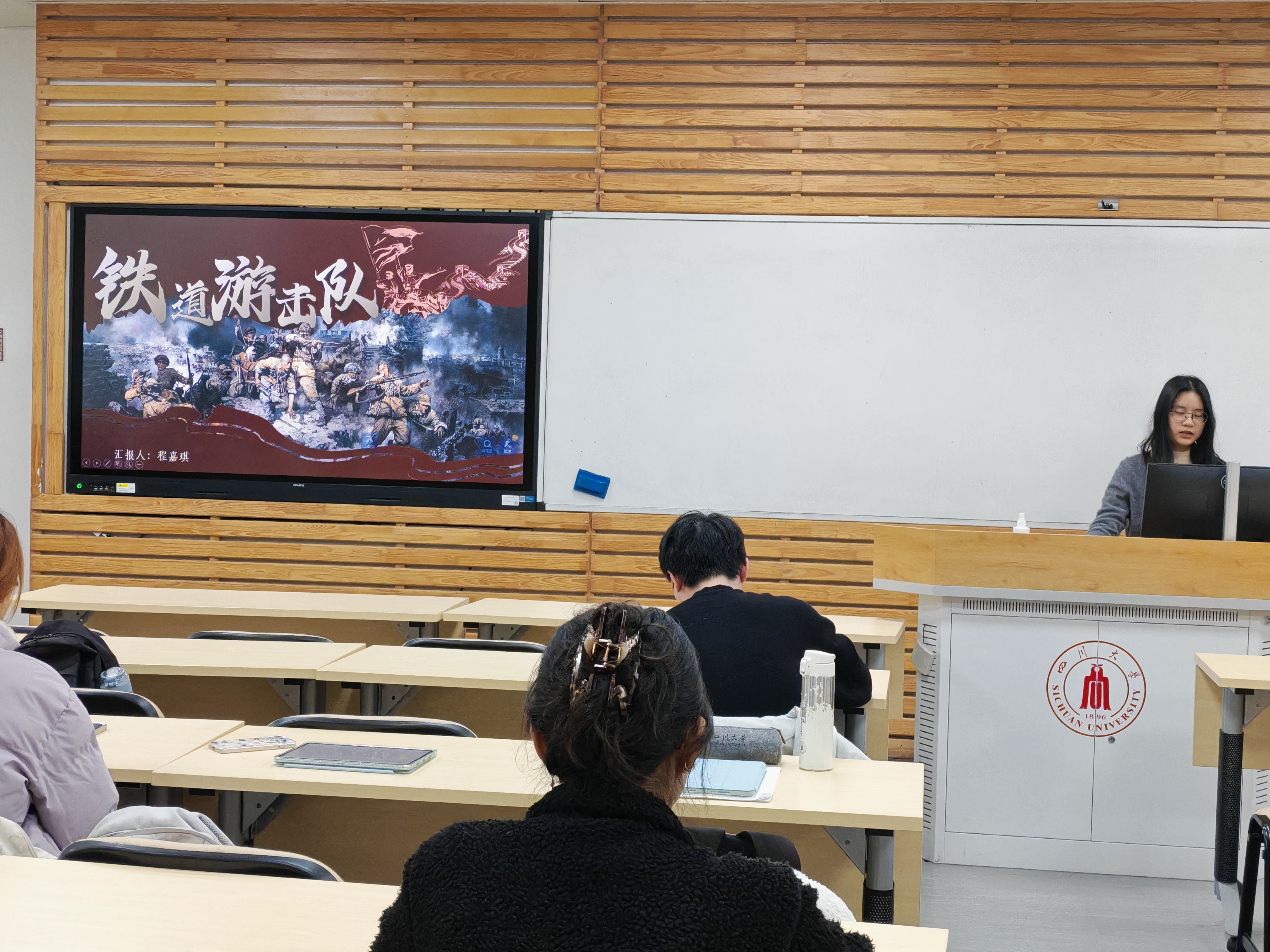 读书分享环节,程嘉琪小组分享了书籍《铁道游击队》,讲述队员们在铁道线上抗击日寇、机智作战的英雄故事。陈然小组解读《论持久战》,呈现了毛泽东同志对抗日战争走势的科学预判与战略智慧,为全民族抗战指明了胜利方向。