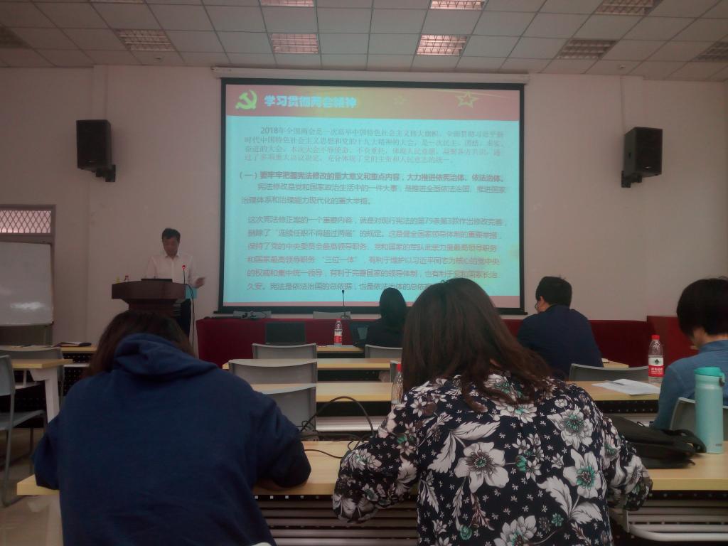 会上邰明松书记首先介绍了2018全国两会的时间安排、主要议程等,帮助大家了解两会的基本情况。重点对习近平主席在两会讲话精神,李克强总理所做政府工作报告,宪法修正案以及国务院机构改革方案等内容进行了传达。邰明松书记指出,今年的全国两会具有重大的政治意义和深远的历史影响,全院上下要认真学习领会全囯两会精神,深入学习领会习近平总书记在两会期间的重要讲话精神,特别是有关教育、科技发展的重要讲话精神,学习领会宪法修正案修改的重大意义,以习近平新时代中国特色社会主义思想为指引,提高政治站位和政治认识,肩负起新时代赋予的新使命,结合工作实际切实把全院上下的思想和行动统一到贯彻和落实两会的决策部署上来。
