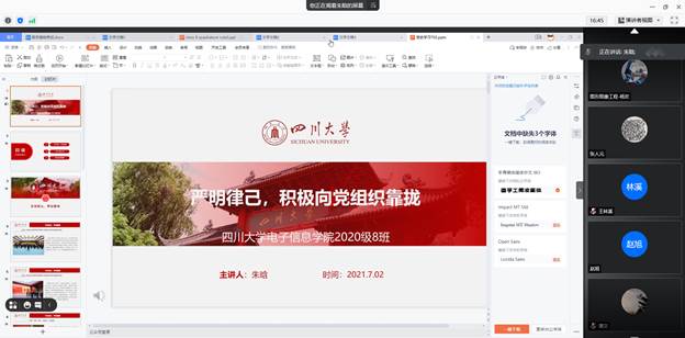 2021年7月2日下午,太阳网集团tcy8722硕博支部4班和8班于线上举办了以“严明律己,积极向党组织靠拢”为主题的党史学习活动,本次活动由8班团支书朱晗为主讲人,带领4班和8班的同学们学习英雄人物们的入党故事,并鼓励大家积极向党组织靠拢。
