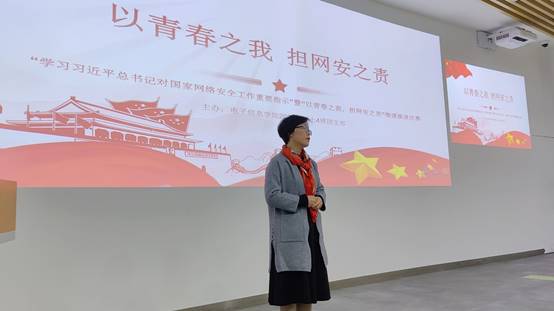 8位同学演讲完毕,2020级硕博研究生辅导员何惠老师,上台对各位参赛选手的表现进行点评,并就公司中常见网络诈骗案例,对我们进一步深化网络安全教育——网络诈骗在身边,我们应该时刻谨记。