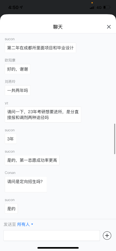 随后便开始了疑问解答环节,同学们在此踊跃发言,向老师咨询具体的情况。如上课和工作的地点,具体的研究方向,招生要求等。