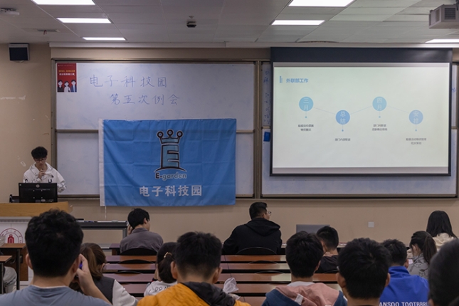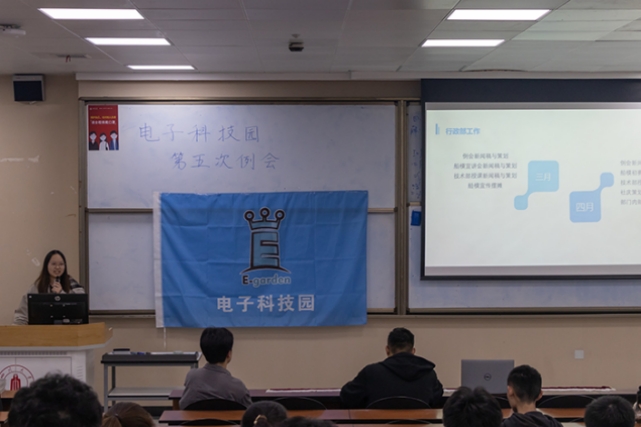 晚上七点半,例会正式开始。宣传部干部谢嬖华同学首先总结了该部门三月的工作:完成了农场装饰天线的制作、船模宣讲会推文、船模摆摊、船模比赛背喷制作等工作,并介绍四月推文等即将到来的工作。此后,外联部干部毛伟力总结了船模宣传摆摊、物资搬运等工作,在四月,外联部的干事们还将完成部门间联谊、迎新晚会排练等。紧接着,行政部干部宋媛媛同学总结了该部门在三月份完成的一系列新闻稿与策划案,并介绍下月的工作安排。技术部干部甘序同学总结了该部门所完成的船模宣讲摆摊、技术部授课等工作,介绍下月将要开展的技术部授课、留任考核与赛后A117清洁整理工作。在各部门总结完成之后,还举行了技术之星颁奖仪式与社庆策划招募工作。至此,电子科技园第二次例会圆满结束。