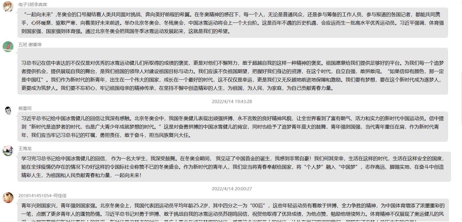线上同学们认真学习完后,纷纷在QQ群发表了感想。作为新时代的老员工党员,冰雪健儿们不畏强手、努力拼搏的精神值得我们学习,我们也定当将青春奉献给国家,将“个人梦”融入“中国梦”,志存高远、脚踏实地,在奋斗中创造精彩人生,为祖国和人民贡献青春和力量,一起向未来!