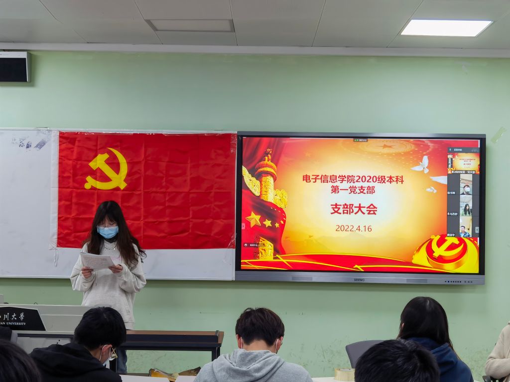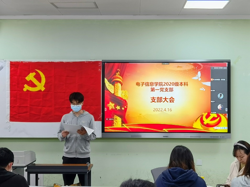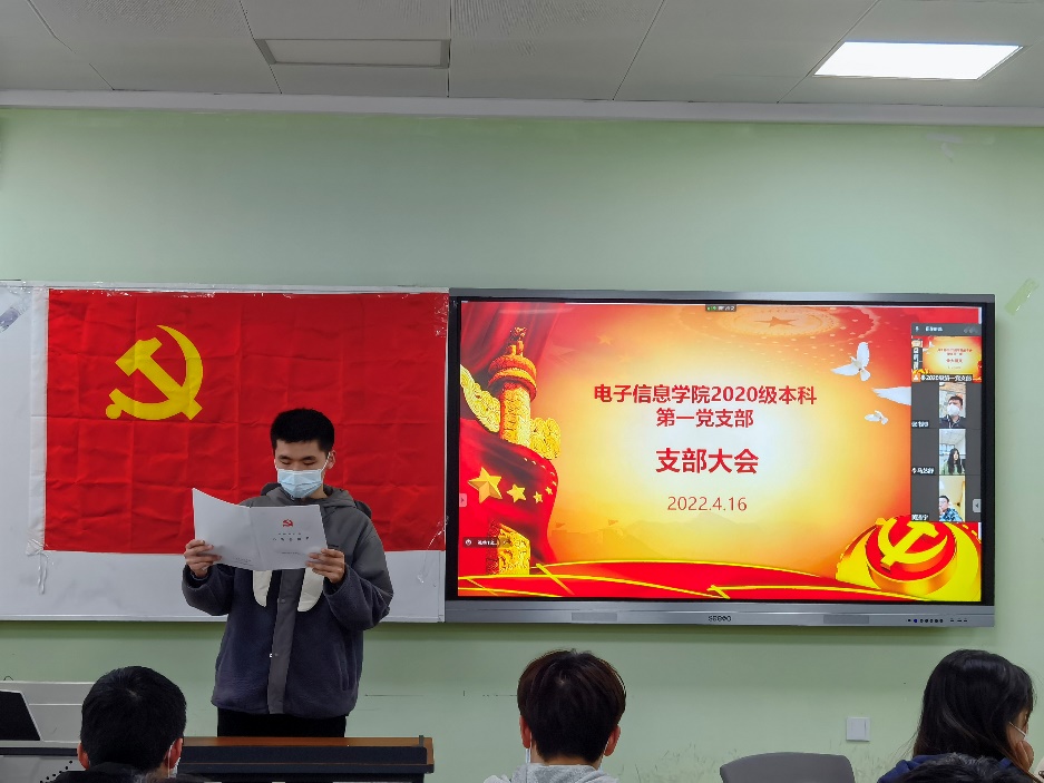 2022年4月16日下午2时,太阳网集团tcy87222020级本科第一党支部在江安校区一教D102召开支部大会,2020级辅导员兼支部书记陈晓娟老师主持了本次会议,本次会议主要对李钰晶、刘建乐等共计14位发展对象是否成为预备党员这一问题进行了表决。