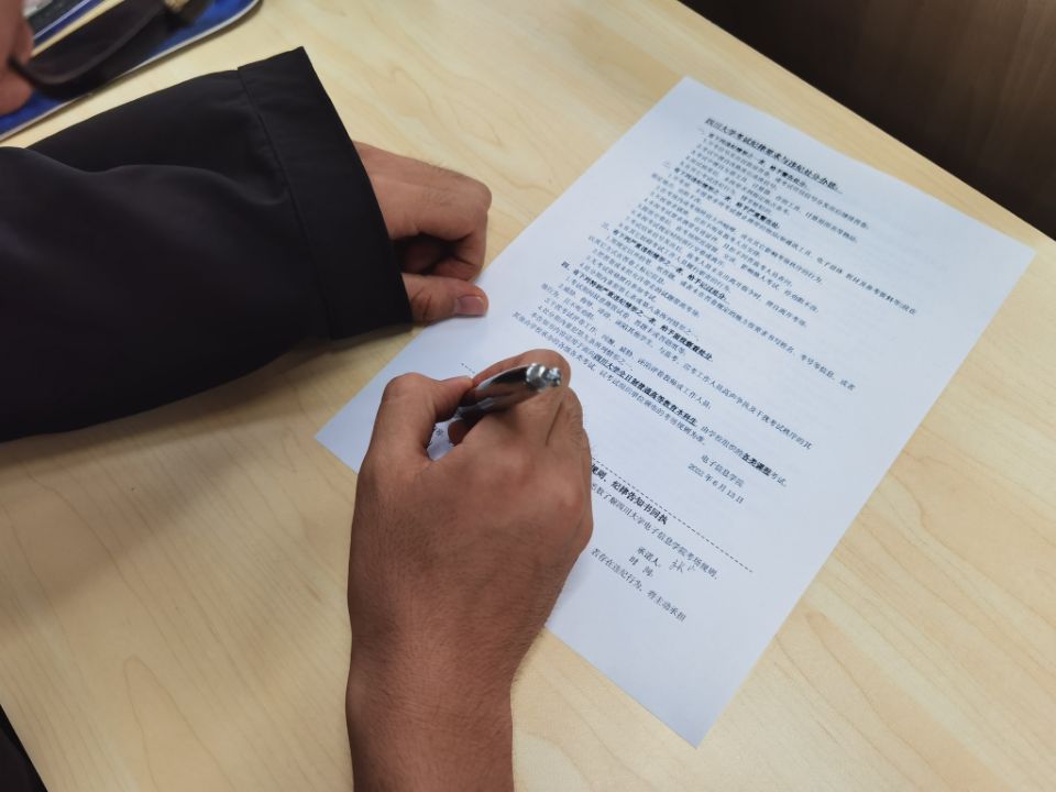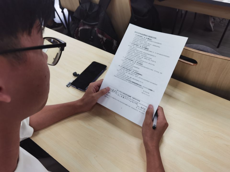 会议上,陈晓娟老师着重强调了遵守考试纪律的重要性。她指出公司及公司高度重视同学们的考试诚信问题,并结合往年考试时员工违纪舞弊被严肃处理的事例,提醒同学们要以诚实守信为荣,以考试违纪为耻。她还提醒同学们注意考场的相关规定细则,切记不要因为大意疏忽而违反了考场纪律。随后为同学们分发了考试纪律承诺表。同学们详细阅读了考试相关纪律,并郑重承诺遵守纪律,签完名后纷纷上交。