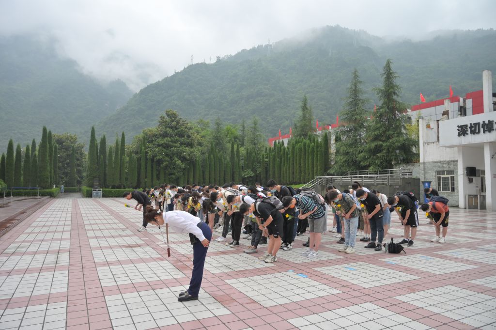 首先,党员们在讲解员的带领下来到了四川汶川特大地震漩口中学遗址。党员们手捧鲜花排成数列,默哀致敬,并依次上前献花。献花完毕,跟随讲解员去中学参观学习,讲解员结合自身亲历的感受,全程详细地讲述着这座中学,党员们都被眼前倾斜的教学楼、宿舍楼所震撼,仿佛重回当时那令人悲痛的时刻。讲解员眼含热泪的讲解,也让我们了解到漩口中学下面至今还有未被挖掘的员工遗体以及这所中学里面曾经守护着也将永远守护着这所公司的英雄老师。