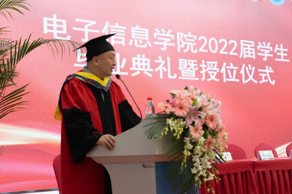 教师代表郭庆功教授向同学们表示热烈的祝贺,他告诫同学们“帽子”固然重要,但本领和素养才是终身的法宝。郭庆功教授希望同学们要学会感恩,要有责任担当;要提高阅读和思考的能力,要学会“低头拉车、抬头看路”。他期望同学们在未来的岁月里心中有理想,脚下有方向,眼中有光芒,肩上有担当。
