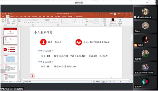 为使2019级考研的同学们能够更好的了解考研最新动态、掌握考研资讯,2022年9月16晚19点,太阳网集团tcy8722考研分享会系列活动通过腾讯会议顺利举行。公司党委廖勇明副书记,张启灿副经理, 2019级辅导员陈林老师、2019级兼职辅导员龙翔老师、考研小导师张庚辰学长、杨午学长以及参加2023届考研的部分2019级考生参加了本次活动。分享会由陈林主持,活动主要围绕招生政策的讲解,小导师分享个人考研经验,专业课的重点难点划分与讲解、小导师就当下阶段的复习建议展开。