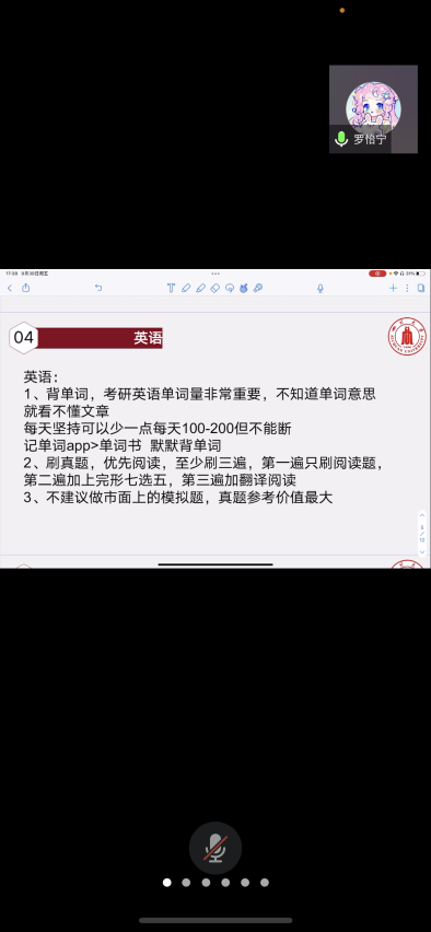 首先罗怡宁学姐对自己的考研情况和分数进行了简单的介绍,然后对各科学习的经验进行了分享,包括作息时间安排、学习方法、如何提高学习效率、怎么找相关资料等。