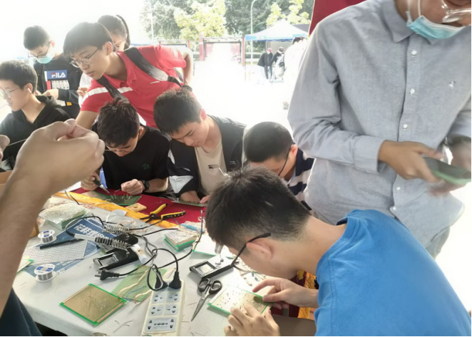 上午8点,“花样焊电阻”大赛正式开始。参与活动的同学在现场领取一块洞洞板和一份电阻之后便开始自己的设计。经过大胆的想象、缜密的思考,参赛者们对如何创作电阻图案已了然于胸。接着,紧张刺激的拼接电阻环节到来。由于是第一次使用电烙铁,部分新生在学长学姐的指导下小心翼翼操作着。最后,参赛者们在完成拼接后用剪刀剪下电阻的长引脚,就这样,一份份饱含参赛者热情与创造力的电阻画作大功告成。尽管焊接的过程或许困难重重,但是大家释放了自己的创意,得到了这一份份令人欣喜与自豪的艺术品。下午6点,“花样焊电阻”大赛圆满结束,同时在赛后会评选优秀作品,并发放奖品。