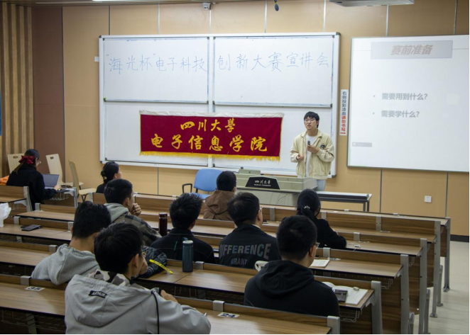 18点15分,宣讲会正式开始,本次宣讲会三位学长依次上台,介绍了他们的个人经历以及获奖情况,随后从竞赛需要的知识储备、如何做好团队配合 、海光杯之外的一些比赛等几方面向同学们科普了海光杯电子科技创新大赛等一系列比赛的大概情况 ,同时学长们又以前几年的比赛题目为例,向同学们展现了电子科技创新大赛的具体情况。同学们对此热情高涨,虽然有的同学因为疫情或是一些其他原因不能够参加线下的宣讲会,但他们也选择了线上收听的方式听完了这次宣讲,整体的气氛活跃。