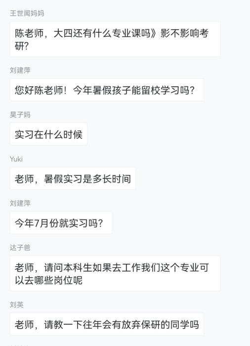 会议最后,大部分家长在评论区提出了自己的问题,陈晓娟老师针对每个问题都做了耐心、详尽的解答,家校之间沟通良好。本次家长会让家长们详细了解了孩子们未来的方向以及规划,有助于帮助员工以后有更好的发展。