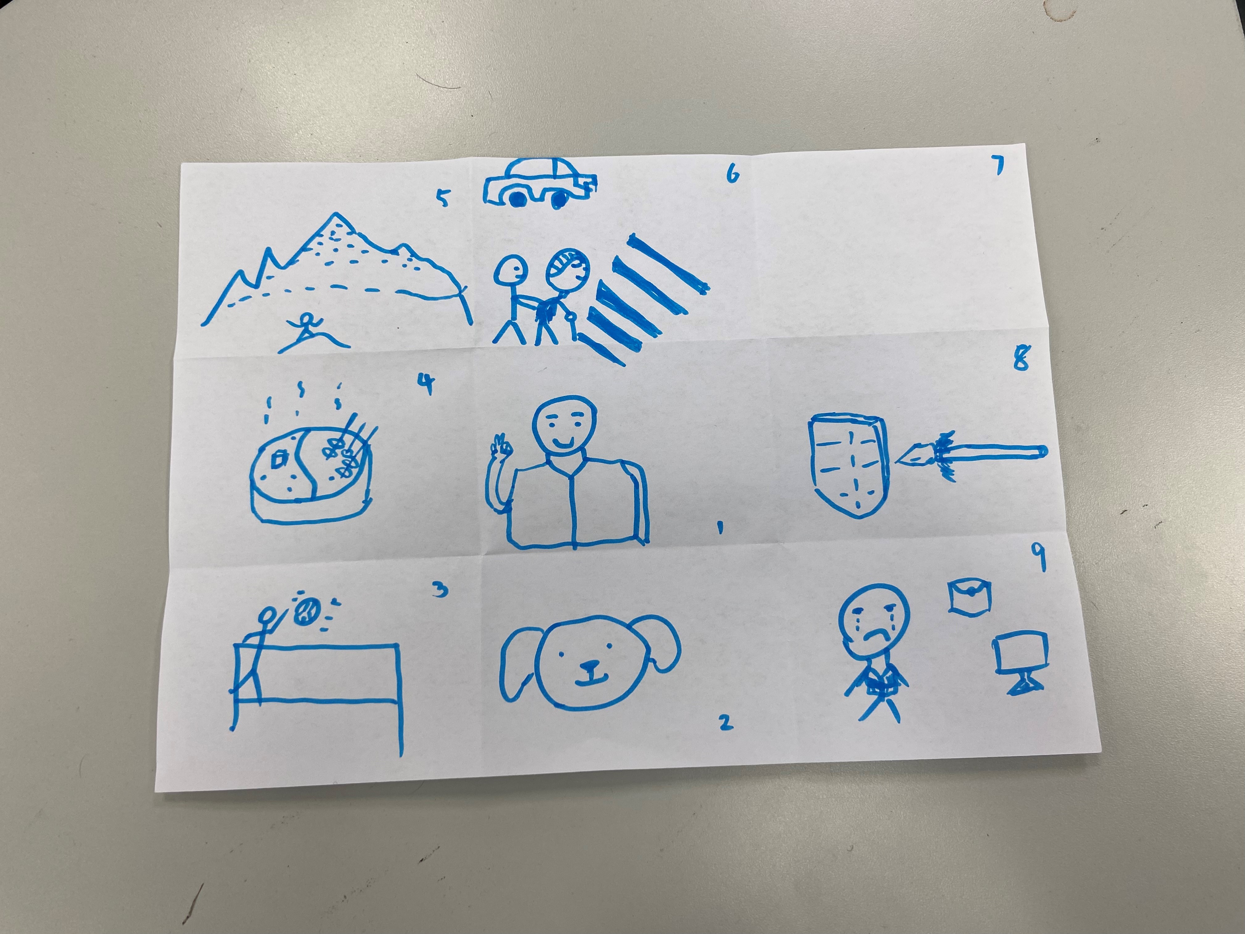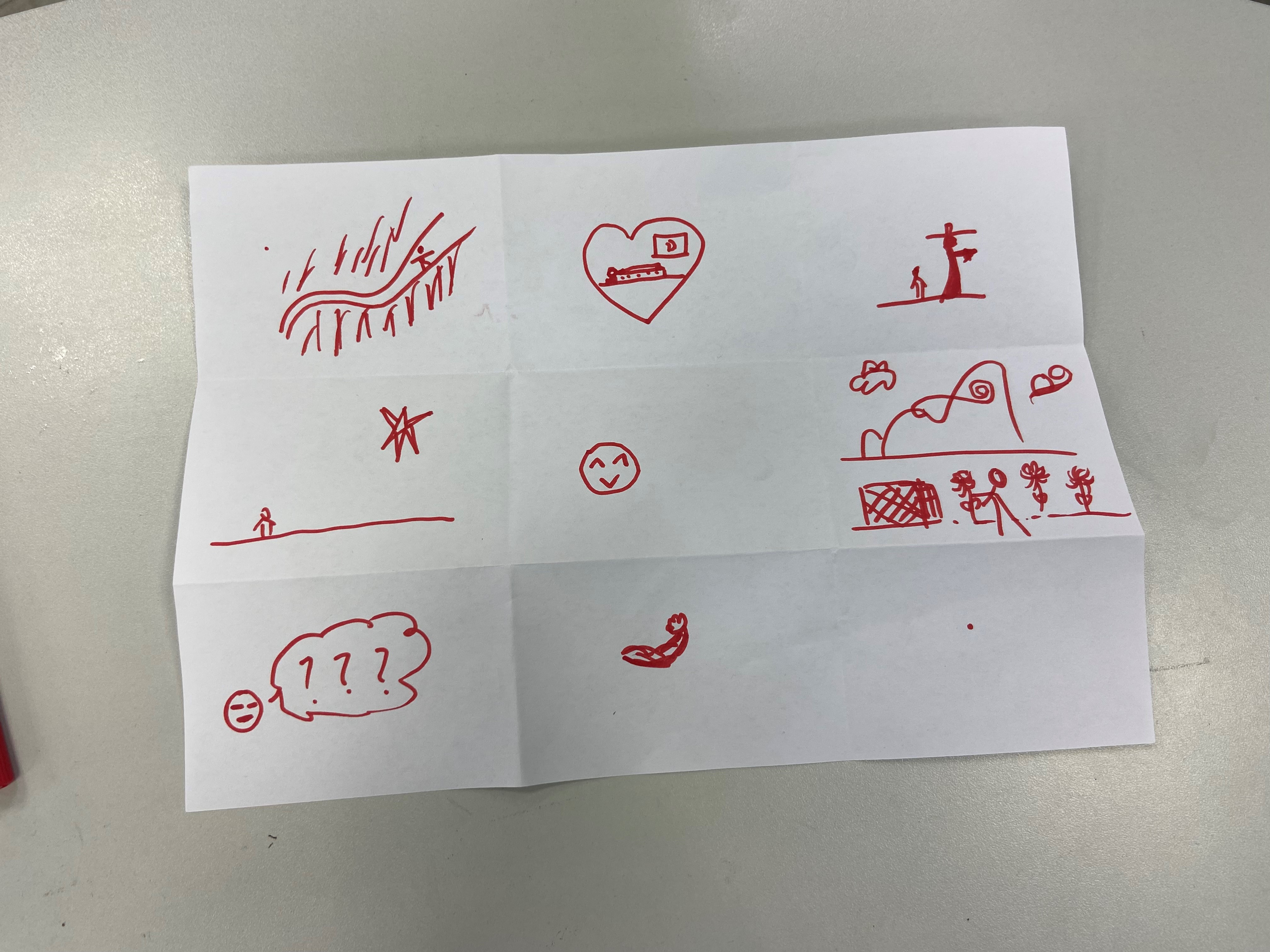 在第二次团体辅导过程中,何老师以“自我分析”为主题,通过自由作画,引导大家进行自我了解与分析。在何老师的引导下,同学们将绘画纸张折叠为9等份,依据时间先后顺序或者同一时间的9个时间切片,将自己的近期状态和感受通过绘画的方式进行描述与表达。何老师依据心理学原理,以同学们的绘画为线索,进一步引领同学们进行自我剖析,重新认识自己。