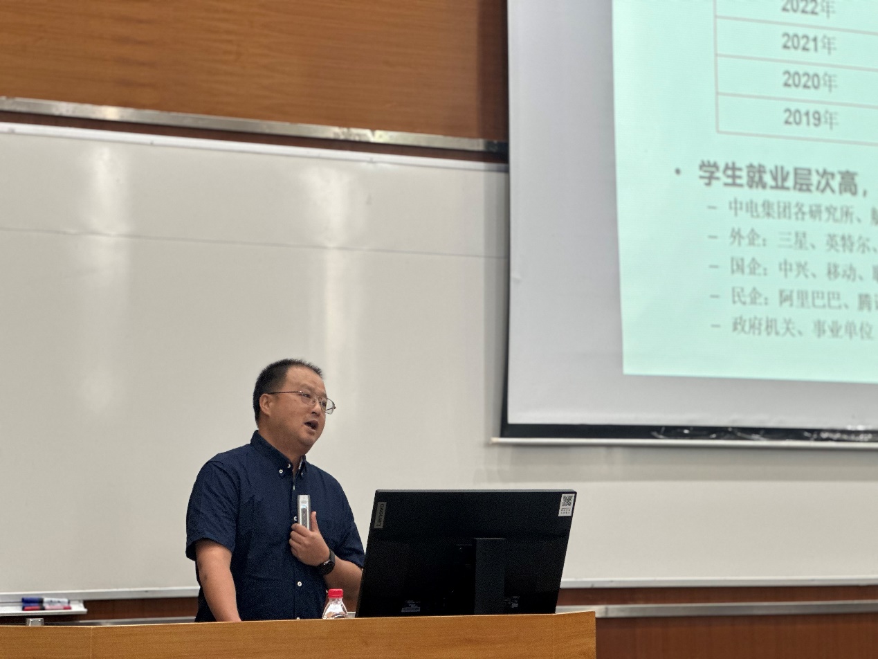 教师代表申俊飞副研究员结合自身求学、工作及科研经历,勉励各位新生珍惜大学学习时光,以梦为马、不负韶华,认真做好学业、职业生涯规划,主动将个人理想追求融入国家战略发展,瞄准“卡脖子”核心技术进行攻关,努力做一名优秀的新时代青年。