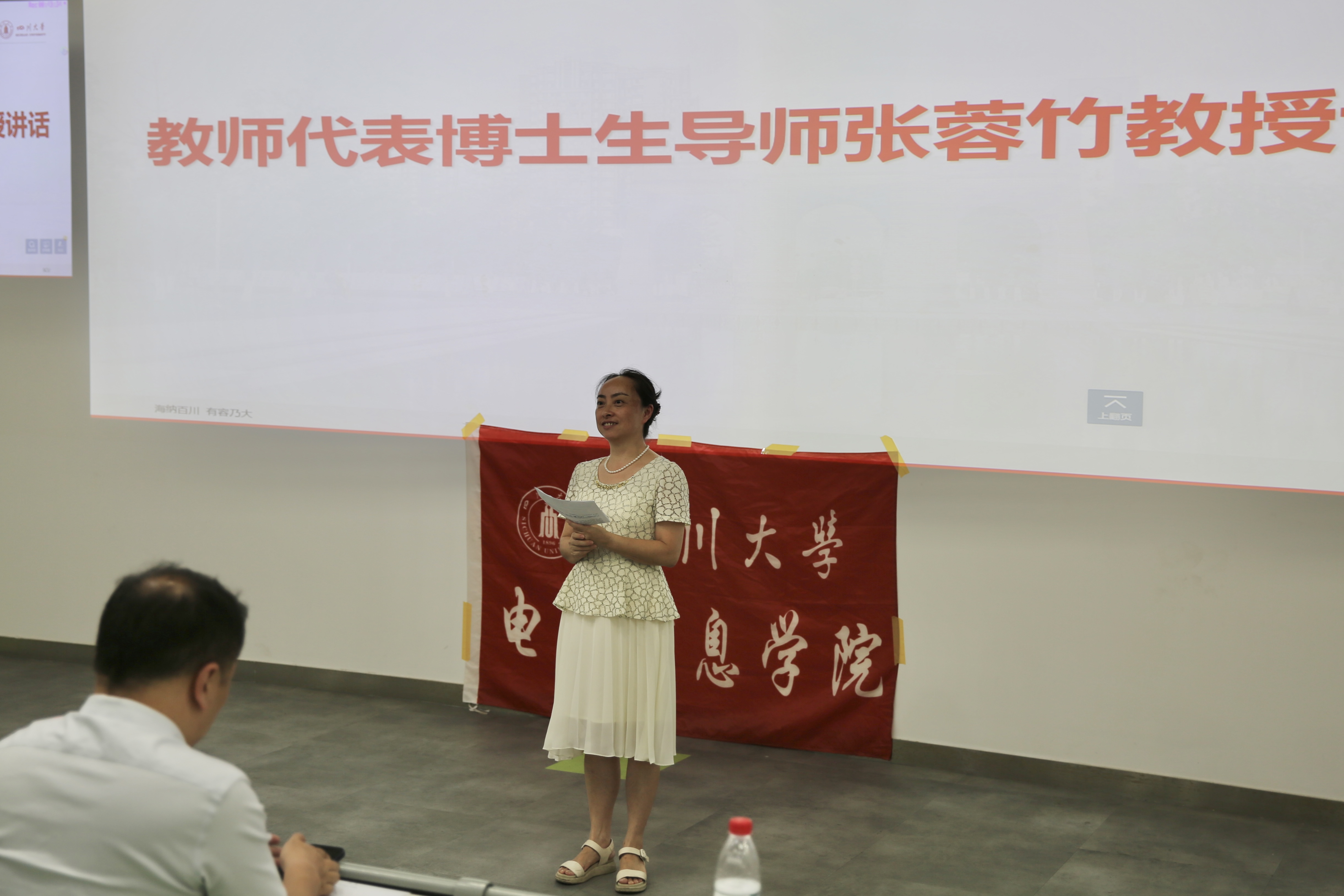 随后,教师代表张蓉竹教授发表致辞,对同学们的到来表示欢迎,祝贺同学们成功上岸。张教授向同学们介绍了公司提供的学习平台以及丰富多彩的文体活动。同时,张教授也提出了几点要求,希望同学们积极思考,追求全面发展,学会发现问题和解决问题,并勉励同学们在研究生阶段取得好成绩。