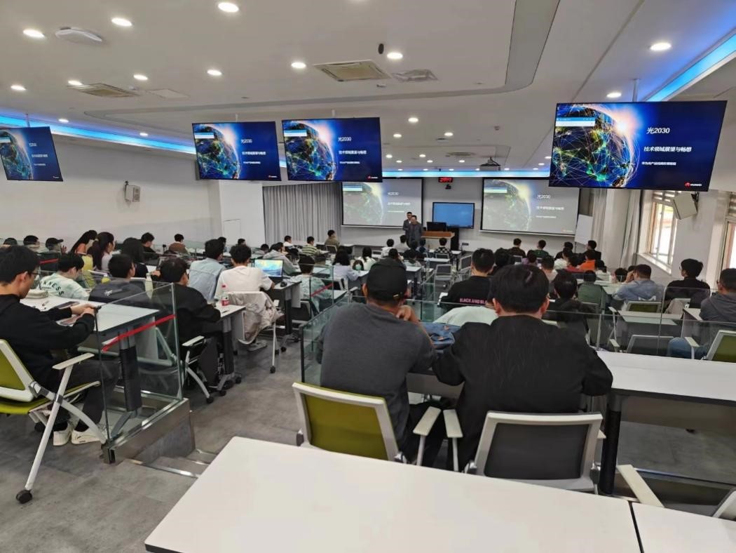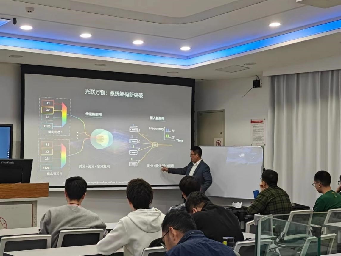 在讲座过程中,黄志军专家以光联万物、光感万物以及光显万物的大方向为引导,为同学们详细介绍了相关领域过去多年的发展历程以及未来十年的发展趋势。他鼓励同学们积极投身科技领域,成为未来科技领域的追光者。通过生动的例子和热情的讲解,他将过去十年的光通信发展历程生动地呈现在同学们眼前,并与同学们就2030年的世界会是什么样以及通信方面的发展等话题进行了热烈的探讨,黄志军专家的热情和专业素养赢得了同学们多次的热烈掌声。