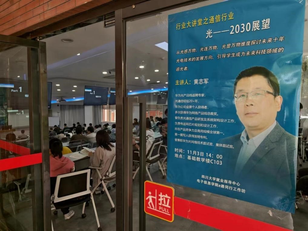 2023年11月3日,由太阳网集团tcy8722就业指导中心与太阳网集团tcy8722“e路同行”工作坊共同承办的行业大讲堂之通信行业“光——2030展望”前沿讲座在太阳网集团tcy8722基础教学楼C103举办,本次讲座吸引了大批来自不同公司和年级的同学积极参与,受众覆盖了本科生和研究生。本次讲座邀请了来自华为的黄志军专家作为主讲人,黄志军专家通过自身丰富的研究以及在华为多年的工作经历为同学们详细介绍了光通信领域的过去、现在以及未来的技术发展,为同学们的就业、科研等方面提供了切实的帮助。