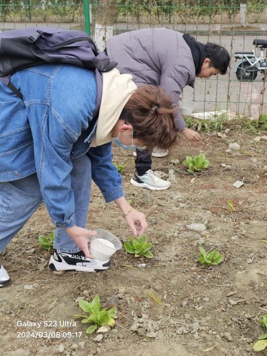 第二天清晨,露珠闪烁着微光,照亮了同学们劳动的身影。他们捧着肥料,轻轻撒向每一棵青翠的莴苣苗,像是给土地披上了一层润泽的斗篷。这份细心和爱护,不仅是对庄稼的呵护,更是对生命的尊重与珍视。每一粒肥料,每一丝清风,都在述说着劳动者与大自然之间的默契与情感,承载着对未来收获的美好憧憬。