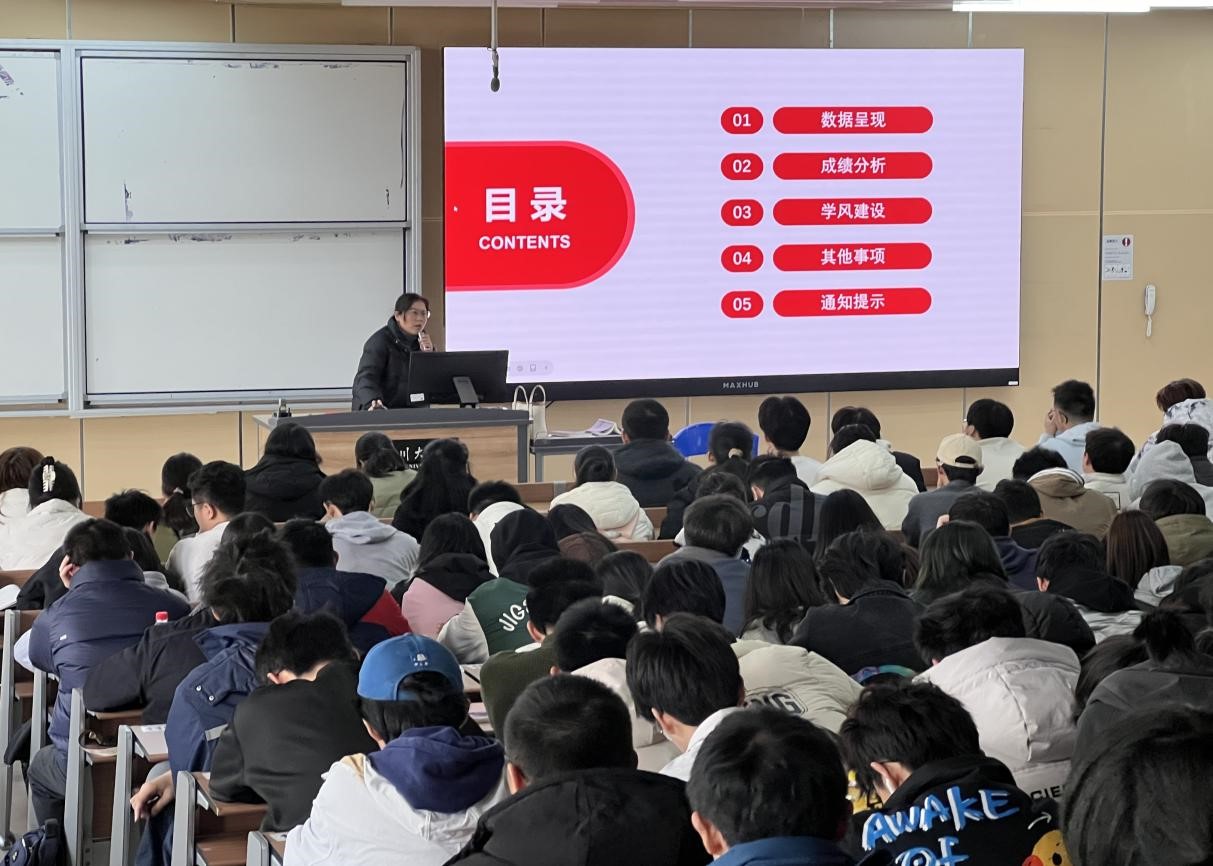 本次大会密切贴合员工的学习和生活,分别从年级成绩的数据呈现、成绩分析、学风建设、其他事项和通知提示五个方面展开。首先,陈林老师通过对同学们上一学期的期末成绩分别进行横向和纵向的对比分析,总结出提高学习成绩的经验方法。在强调养成良好学习习惯的同时,陈林老师也非常重视年级的党建活动、请假制度的规范等事务性工作。在陈林老师的感染下,现场的同学们认真倾听,积极与老师进行交流。最后,陈林老师发布了招聘年级长和党支部助理的通知,鼓励同学们踊跃报名参加。