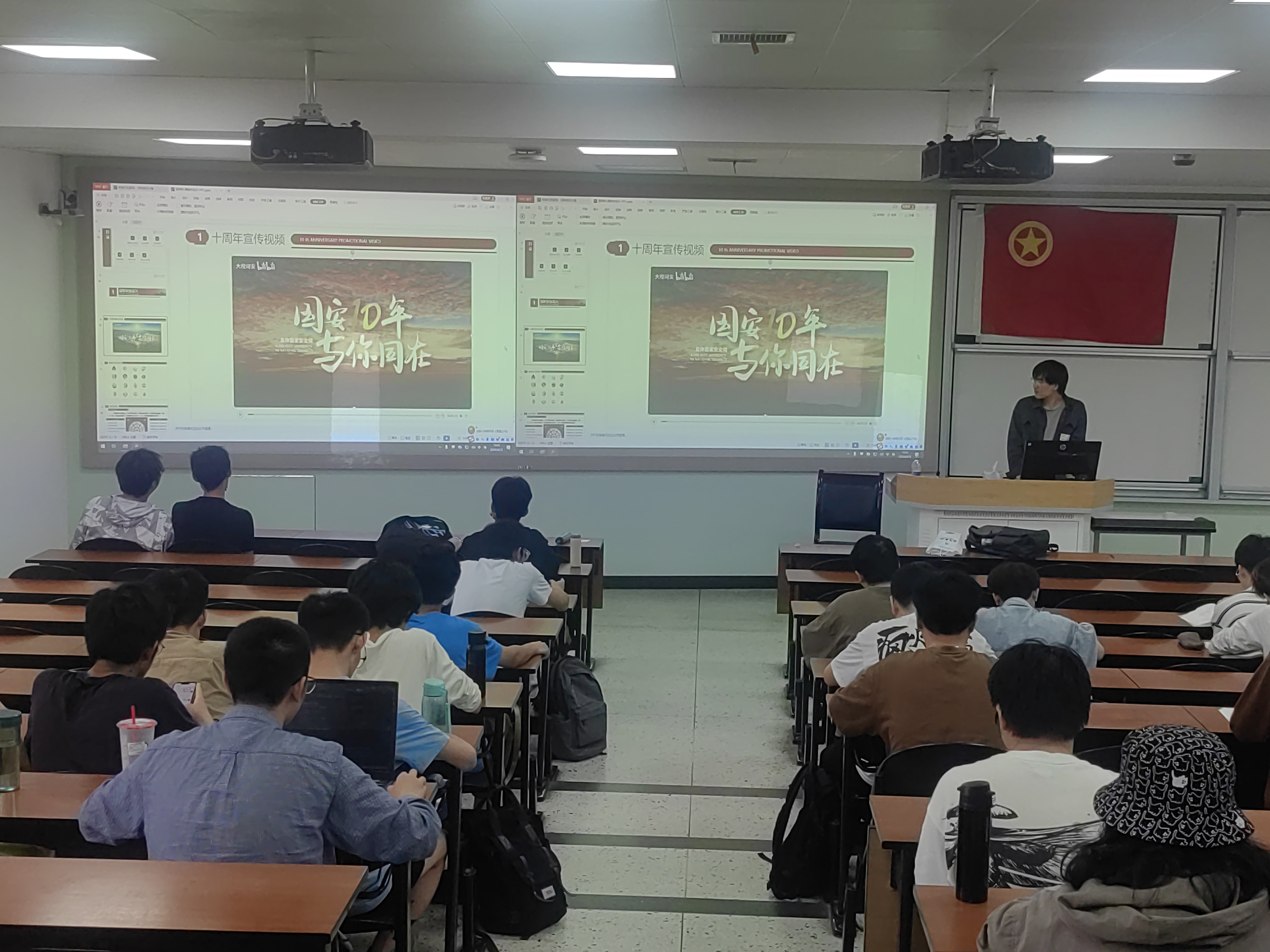 接着同学们一起观看了总体国家安全观十周年的宣传视频《国安10年,与你同在》。该视频讲述了国家安全包括网络安全、海洋安全、国防安全等多个类别,总结了十年间国家安全对人民、社会和国家的重要意义,并鼓励大家积极投身于国家安全建设。