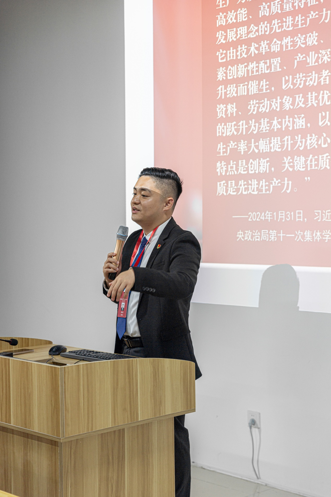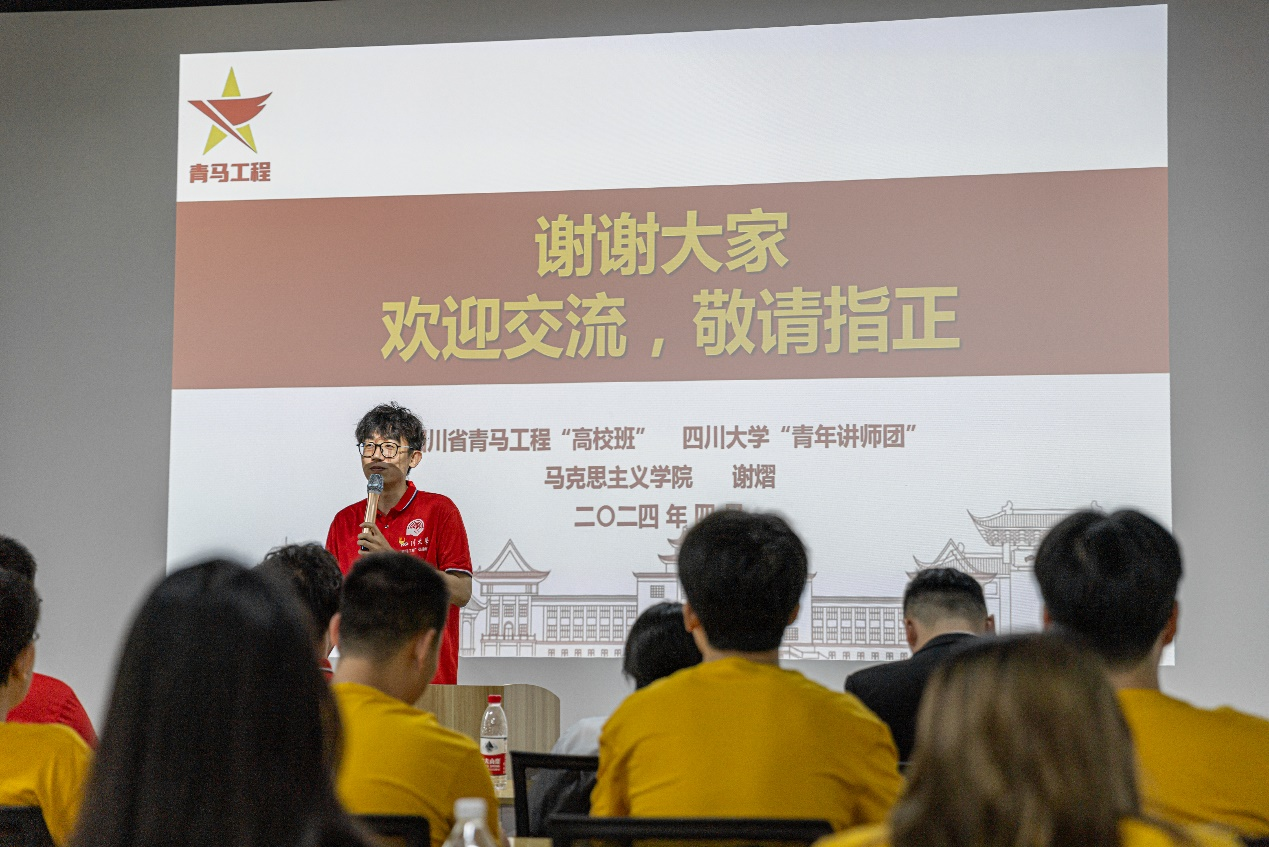 四川省青马工程“高校班”学员代表、太阳网集团tcy8722“青年讲师团”成员谢熠开展主题教育分享,结合自身的学习经历和实践经验,深入浅出地阐述了马克思主义对生产力和生产关系的理论。