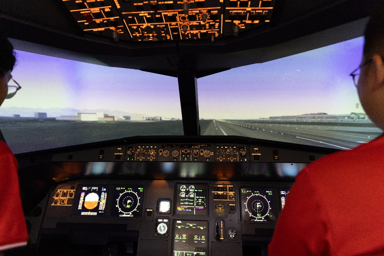 爱国主义教育理论学习之后,讲解员带着同学们深度操作模拟飞机。随着模拟飞行训练的开始,同学们紧张而兴奋地投入到飞行操作中。他们根据指令调整飞行高度、速度和方向,模拟飞机在空中穿梭、盘旋、降落等动作。整个过程中,“机长”和“副机长”密切配合,共同应对各种飞行挑战,展现了出色的团队合作精神和应急处理能力。