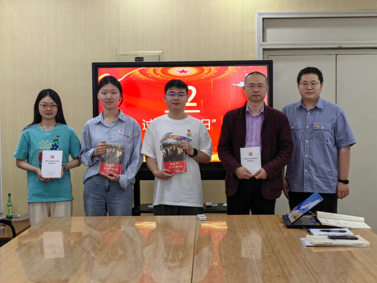 为进一步强化党员党性教育,提高党支部凝聚力,做到服务师生有力,进一步发挥党员先锋模范作用。会议第二项,庆祝五月前入党同志的政治生日,申鑫同志带领全体党员重温入党誓词,并向过政治生日的党员同志赠书,教育党员牢记入党誓词、铭记党的宗旨,做一名忠诚捍卫党章的合格党员。