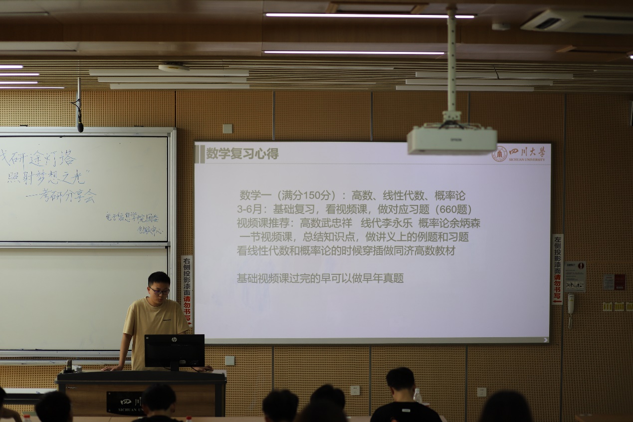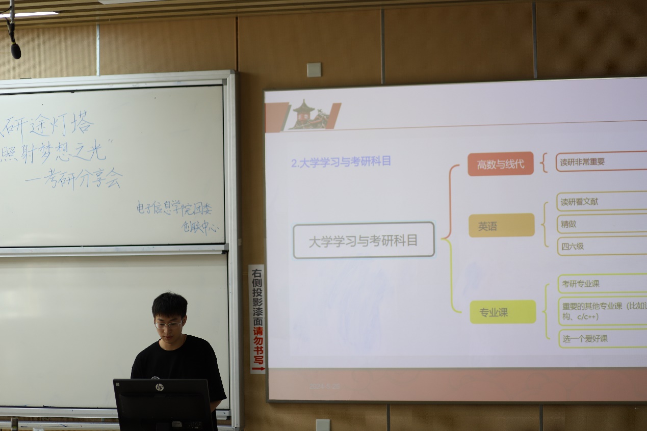 分享会上,张凯首先上台,详细讲解了考研的备战流程,包括如何制定复习计划、选择适合自己的复习方法与教材等,他结合自己的考研经历,为同学们提供了宝贵的经验分享。随后,杨宗鑫上台,他着重介绍了研究生的分类、学费标准等基础知识,并分享了如何调整考研过程中的心态,以最佳状态迎接挑战。