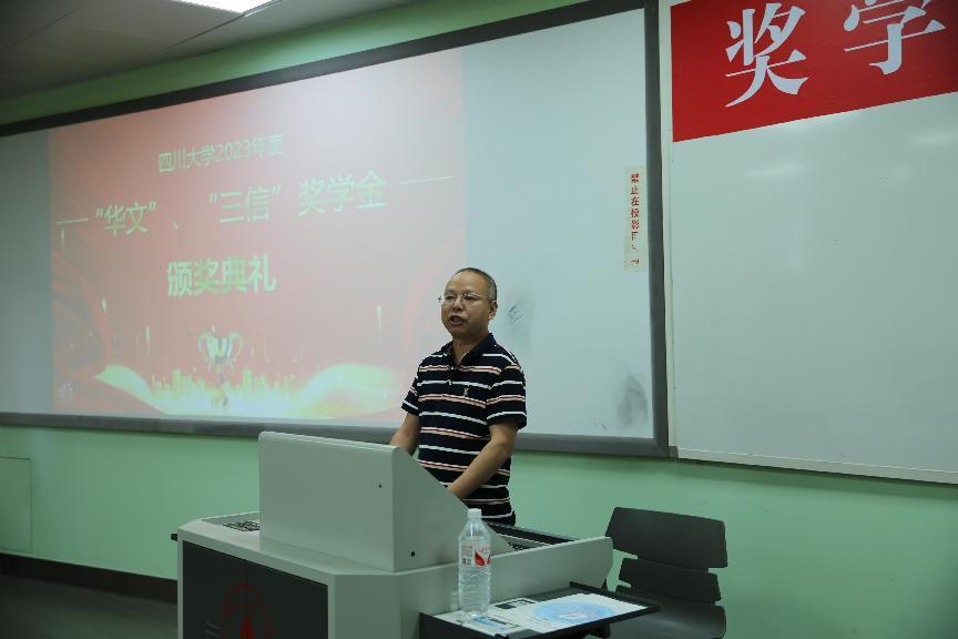 最后杨阳经理为“三信”获奖同学颁奖并发表讲话,杨经理感谢重庆三信电子有限公司近三十年一如既往,对公司学子持续关爱与资助,我们川大电子人要心怀感恩之情。杨经理希望所有川大电子人作为新时代的优秀青年,在“三信”奖学金的鼓励下,为中国电子信息产业的发展做出贡献,为社会主义现代化的崭新篇章努力奋斗。