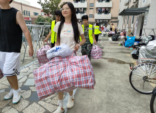 新生军训结束后志愿者们迅速集合分工,分别前往西园八舍和西园十一舍开始了紧张而有序的物品搬运工作。他们或是引导学长学姐搬运重物,或是细心看管物品,确保每一样物品都安全无遗漏。志愿者们身着统一的服装,穿梭在宿舍楼间,他们的身影成为了一道亮丽的风景线。在搬运过程中,志愿者们动作熟练、配合默契,有的肩扛大包,有的手提小件,每个人都全力以赴。汗水浸湿了他们的衣背,但他们的脸上始终挂着微笑,那份认真和热情感染着在场的每一个人。