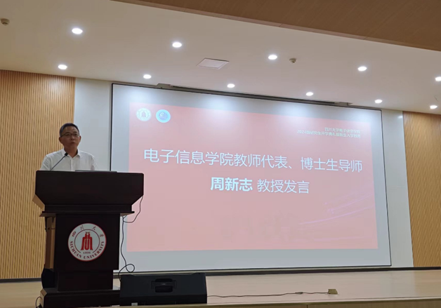随后,周新志教授作为教师代表对新生表示热烈欢迎,祝贺他们迈入学术新征程。他勉励新同学们要适应角色身份的转变,勇于尝试和创新,学会独立与合作,学会管理时间和压力,在勇攀科研高峰的路上不断收获知识、收获友谊、收获成长,在追求梦想的旅途中不断成就更加优秀的自己。